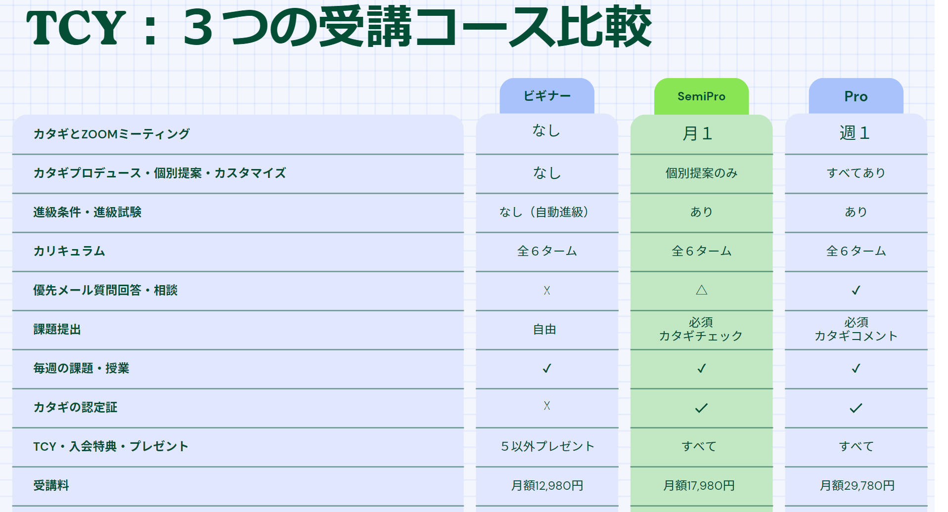PROコース、SemiProコースはカタギさんとのZOOMミーティングがある、ということです、これはZOOMではなく、例えばLINEでもいいでしょうか。 |