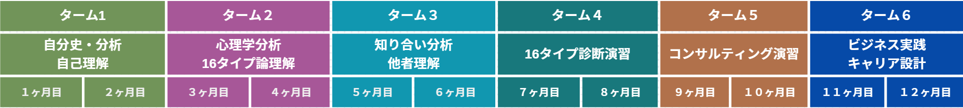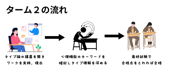 内容はTCY養成コース各タームの授業と課題説明になります。授業と課題はタームに沿った内容になります。(例えば、ターム1”自己理解の章”だと自分史や自己理解関連、ターム2”16タイプ理解の章”だと16タイプの知識に関して、ターム3”他者理解の章”だと身近な人物の特徴や記述に関して、などになります)