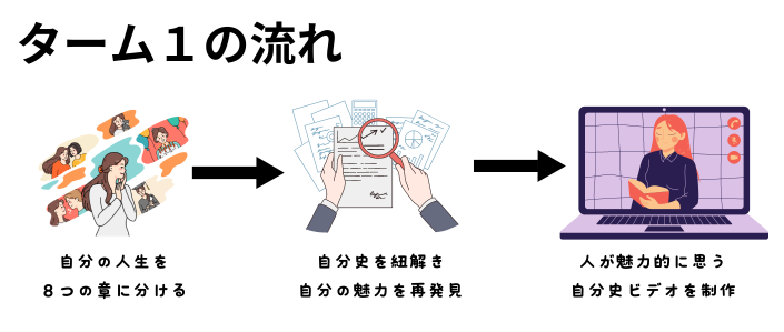 そして、その後2ヶ月かけて、自己分析と自分史の再構築をしていき、ターム1の最後には自己紹介ビデオを作ります。この自己紹介ビデオは単に講座の一部として作るのみならず、そのまま将来あなたが性格コンサルとして独立したときに、自己紹介ビデオとしてSNSなどでそのまま使えるクオリティのものを作成します。