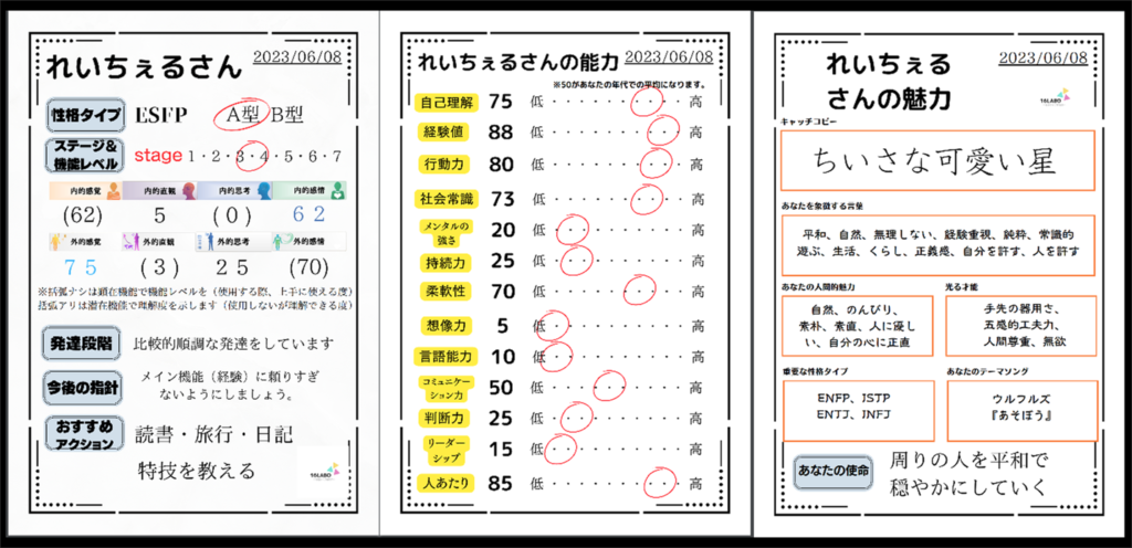 自己診断(このタイプでほぼ間違いないと思ってた)とは違っていてビックリしたけど、診断結果聞いていくうちに納得できることが多くなって面白かったです。